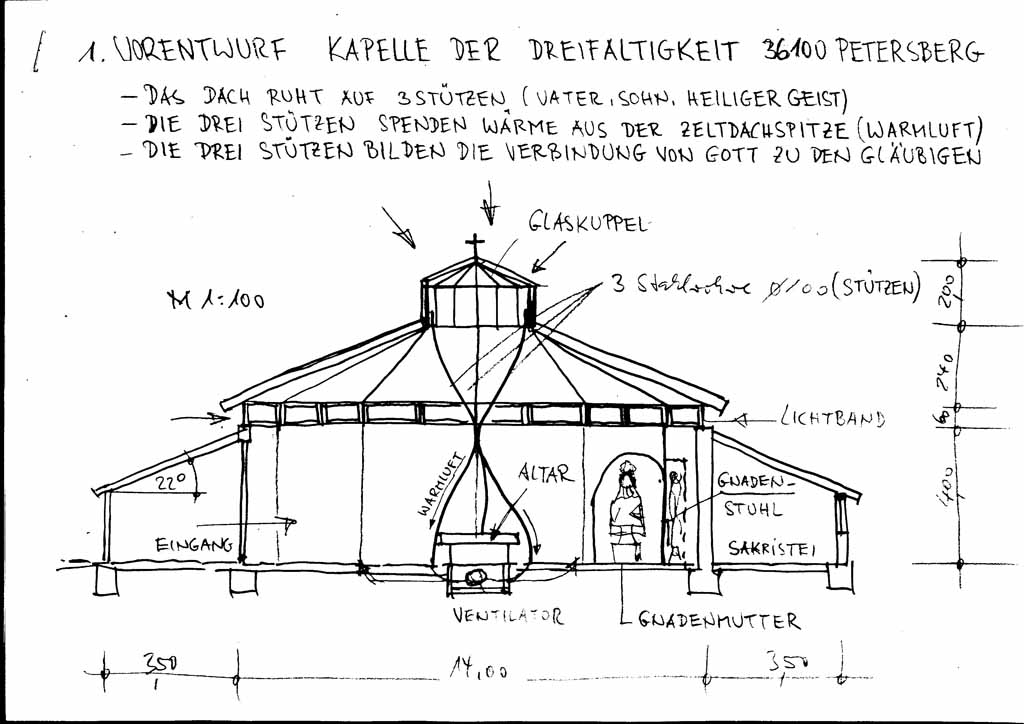 Die Kirche wurde von Architekt Wilhelm Koch, Petersberg, entworfen. Der Bau der Kirche wurde vom Landkreis Fulda jedoch abgelehnt, da der Gehaus-Küppel kein Baugelände war. Alle Versuche sind damals gescheitert. Inzwischen stehen dort einige Häuser. Msgr. Vogel hatte für das geplante Heiligtum schon die Schwestern vom kostbaren Blut (Aufhausen) engagiert. Da der Bau aber nicht bewilligt wurde, hat sich alles wieder zerschlagen.