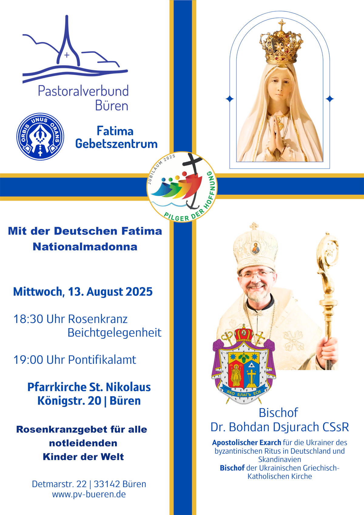 die Muttergottes gab uns in Fatima die Zusicherung: „Wenn man auf meine Wünsche hört, wird Friede sein...“. Dieser Friede ist heute an vielen Stellen in Gefahr, in der Welt, in der Kirche und in den Familien. Um den Frieden zu erhalten und wiederherzustellen, ist es daher dringend geboten, die Bitten der Himmelskönigin ernst zu nehmen und zu erfüllen. Dazu sollen unsere täglichen Gebete und die angebotenen Veranstaltungen dienen, zu denen wir Sie recht herzlich einladen.