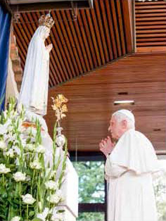 Vor der Statue der Jungfrau Maria in der Erscheinungskapelle kniend, sagte der heutige Papst Emeritus, dass die Überreichung der zweiten Goldenen Rose ein „Zeichen der Dankbarkeit“ für „die Wunder, die der Allmächtige durch dich in den Herzen so vieler gewirkt hat“ sei.