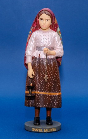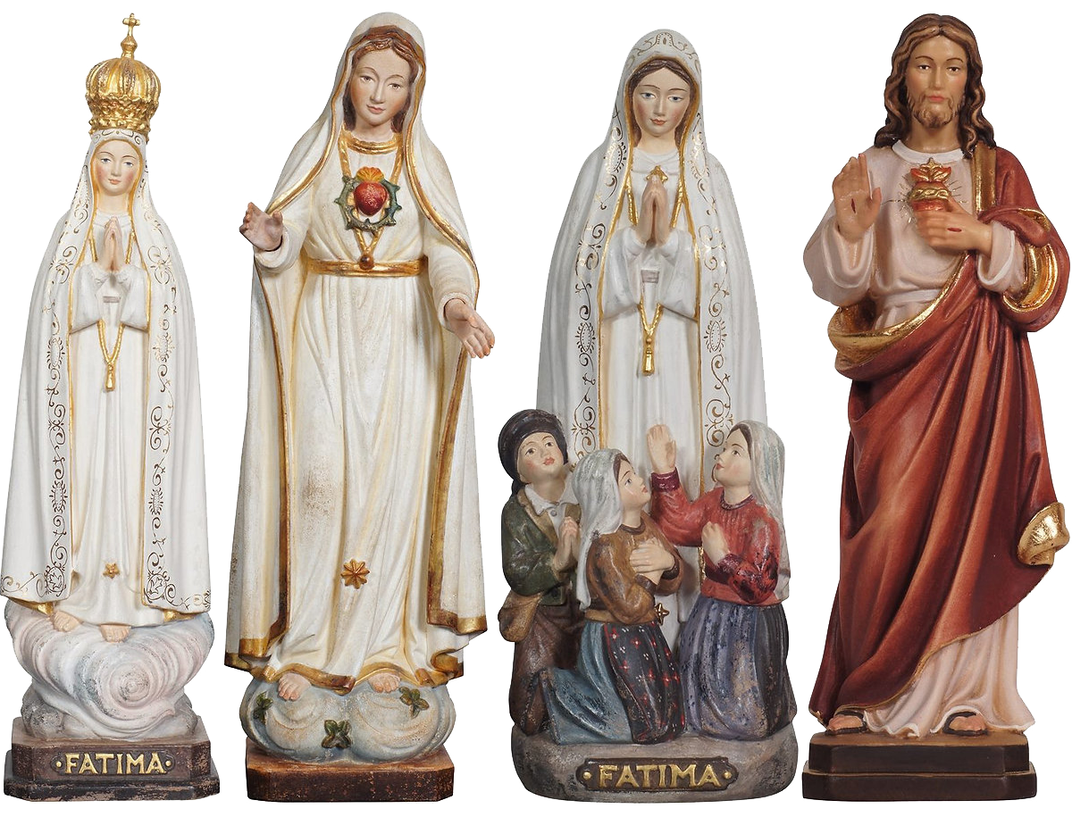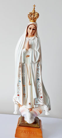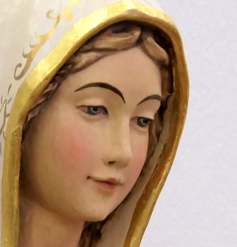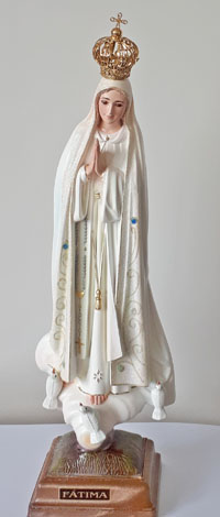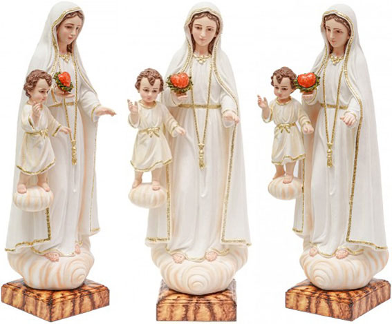 Eine wunderschöne Statue Unserer Lieben Frau mit dem Jesuskind, wie sie Schwester Lucia am 10. Dezember 1925 im Kloster von Pontevedra, Spanien, erschien, als sie um die Andacht am ersten Samstag bat.
