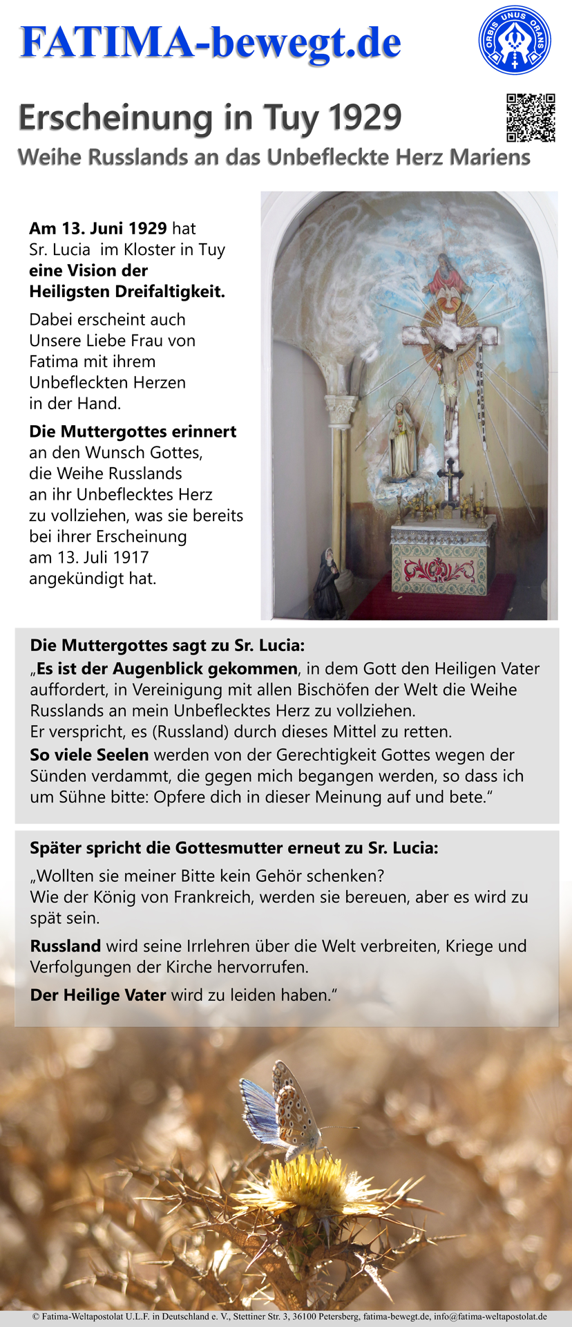 · „Es ist der Augenblick gekommen, in dem Gott den Heiligen Vater auffordert, in Vereinigung mit allen Bischöfen der Welt die Weihe Russlands an mein Unbeflecktes Herz zu vollziehen.