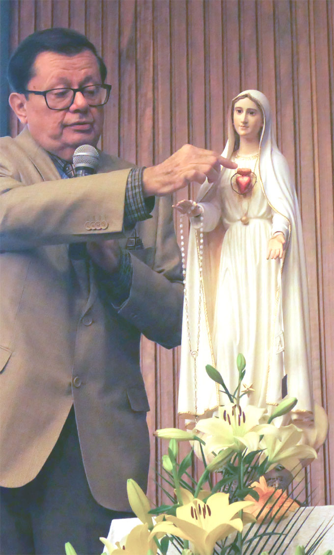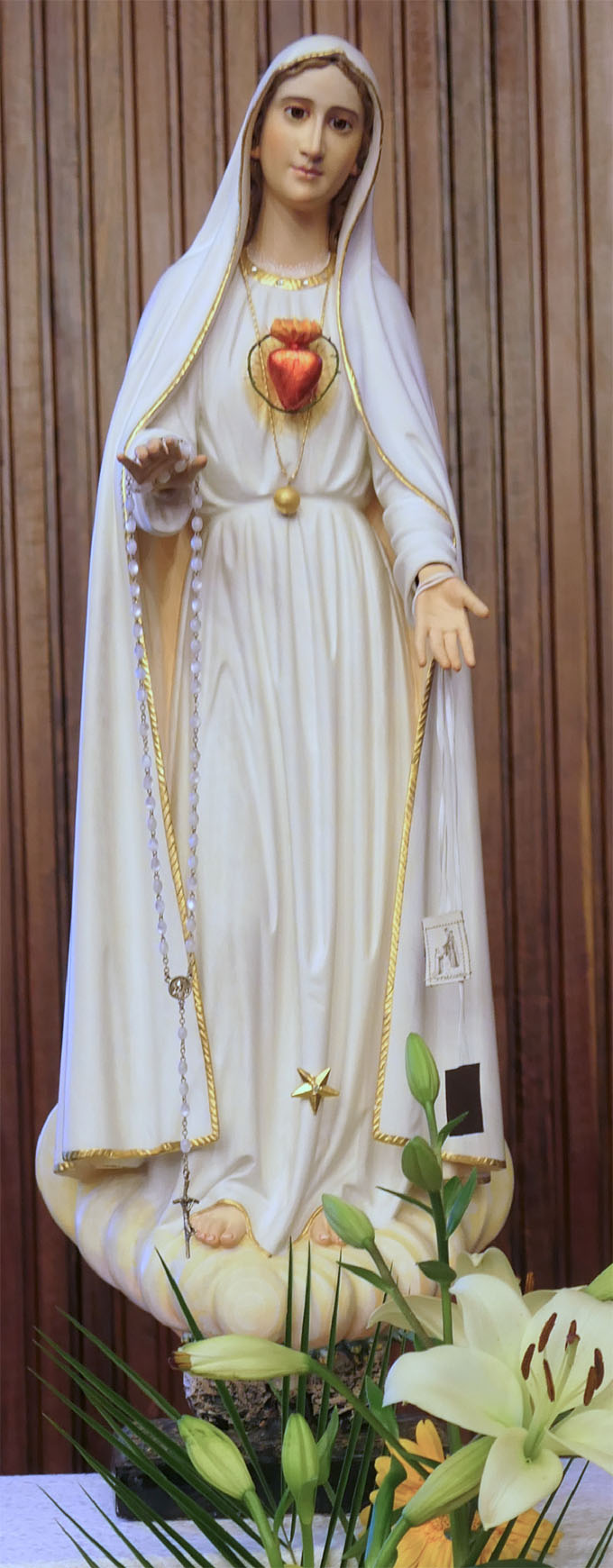 …unten an ihrem Kleid, in direkter Linie zu ihrem Herzen, finden wir einen Stern. Er symbolisiert Maria als Stern der Neu-Evangelisierung der Welt, was die wichtigste Mission des 20. und 21. Jahrhunderts ist. Wie es schon die Päpste Johannes Paul II. und Benedikt XVI. uns gelehrt haben, ist die Botschaft von Fatima ein ideales Instrument für die Neu-Evangelisierung der Welt. Neu-Evangelisierung ist nötig, da so viele ihren Glauben verloren haben. Die Botschaft von Fatima stellt das Evangelium in die Mitte und bewahrt es in seiner Reinheit und seinem Glanz.