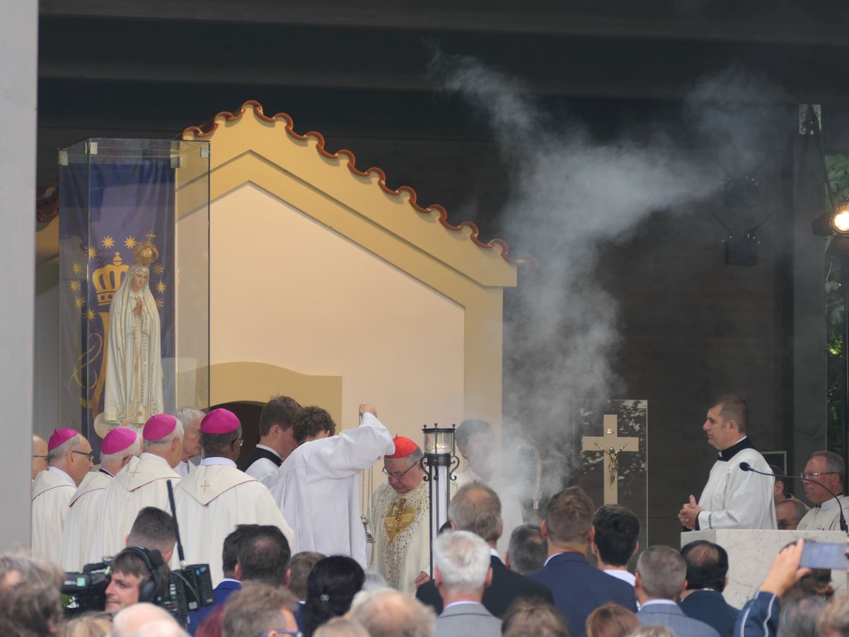 Die Weihe des Altares der Capelinha nahm der emeritierte Kardinal Dominik Duka vor. Nachdem der Altar mit Weihwasser besprengt und mit Öl gesalbt worden war, wurde Weihrauch auf dem Altar entzündet. Zwei Frauen, die eine war die Architektin der Capelinha, breiteten das Altartuch auf dem Altar aus. Nachdem Leuchter und Blumenschmuck gebracht worden waren, konnte die Eucharistiefeier beginnen. Die Gaben wurden von drei Kindern gebracht, die die drei Hirtenkinder von Fatima darstellten, ferner von Vertretern der Trachtenvereine und der Gemeinde.