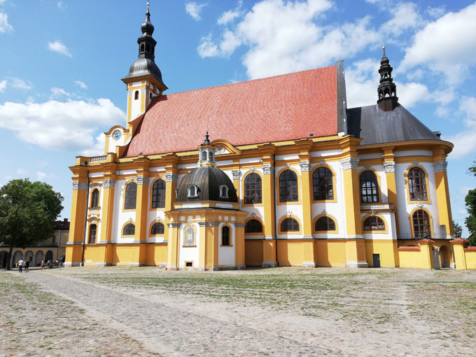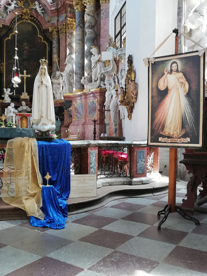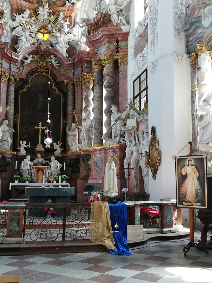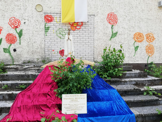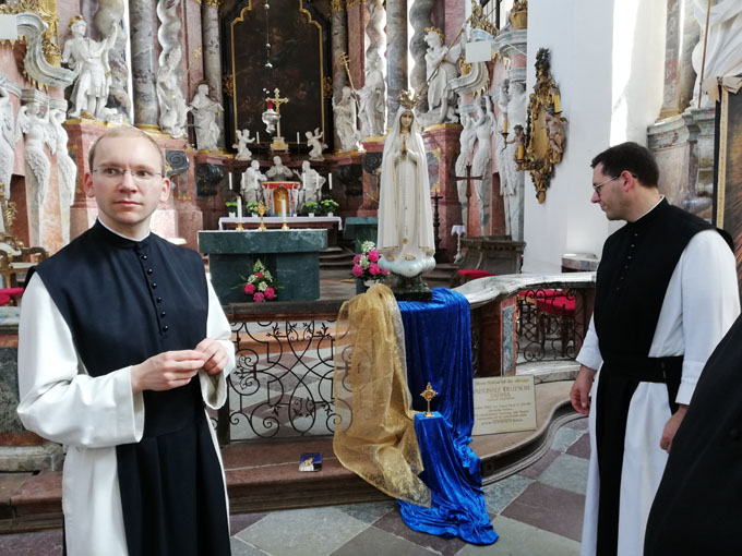 An der Kreuzung Neuzelle/Treppen entschieden wir, da wir noch viel Zeit hatten, nach Neuzelle ins Kloster zu fahren. In der wunderschönen Stiftskirche durften wir, ohne vorherigen Termin aber in Absprache mit dem Prior die Gottesmutter aufstellen. Nach dem Stundengebet der Mönche wurde sie mit einer kleinen Andacht begrüßt. Wir wurden spontan von den Brüdern ins Pfarrhaus zu Kaffee und Eis eingeladen. Anschließend fuhren wir mit Pater Alberich Maria, Neupriester und den Dominikanerinnen aus Potsdam und Benediktinerinnen aus Köln im Konvoi nach Treppeln in das Waldareal für das künftige Kloster „Maria Mutter Friedenshort“. Bei bestem Sonnenschein baten wir die Gottesmutter im Wald vor einem alten Gebäude in einer Andacht um reichen Segen für den Neubau des Klosters. Während die Familie des Vorsitzenden des Fördervereins bei der Gottesmutter blieb, erfuhren wir bei einem kleinen Rundgang die Geschichte des Ortes und die Zukunftspläne der Klostergemeinschaft. Was für ein Ort und mit welcher Vergangenheit! Gott ist groß und will wachsen in großen Visionen. Zum Abschluss erteilte Pater Alberich noch allen den Primizsegen.