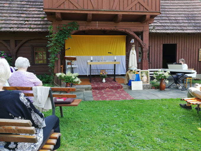 Wie im vorigem Jahr findet auch in diesem Jahr eine Pilgerreise der Nationalen Deutschen Pilgermadonna u.a. im Bistum Dresden-Meißen statt. Nach Dresden und Leipzig durfte die Gemeinde die Pilgermadonna zur Heiligen Messe am Samstag, dem 24. Juli 2021 in der Kapelle St. Marien in Pulsnitz begrüßen. Eigens für Deutschland weihte anlässlich des 50. Jahrestages der Erscheinungen der Muttergottes in Fatima Papst Paul VI am 13. Mai 1967 eine Pilgermadonna. Diese Pilgermadonna ist nun bei uns unterwegs um „Hoffnung zu bringen“ und das auch in unsere Gemeinde. Bei bestem Wetter, allerdings bei hohen Lufttemperaturen, fand die Heilige Messe im schönen Garten der Pulsnitzer Kapelle mitten in einer Blumenpracht mit Musik und Liedern festlich statt. In seiner Predigt verwies unser Pfarrer Frydrych darauf, dass für alle Menschen, nicht nur für Christen, Zeichen wichtig sind, Zeichen, die uns beflügeln und Hoffnung geben. Und diese Hoffnung bringt uns auch unsere Pilgermadonna, unsere Gottesmutter. Sie kommt zu uns! Öffnen wir unsere