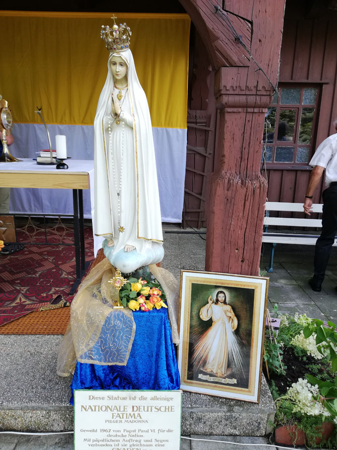 Türen und lassen wir sie in unsere Herzen hinein. In den Erscheinungen von Fatima wurde den Seherkindern durch die Muttergottes immer wieder aufgetragen, täglich den Rosenkranz zu Ehren Unserer Lieben Frau vom Rosenkranz zu beten, um den Frieden für die Welt zu erlangen. So schloss die Heilige Messe mit einer Eucharistischen Anbetung und einem kurzen Rosenkranzgebet. Die Messebesucher waren froh und dankbar, die Fatima-Pilgermadonna in ihrer kleinen Kapelle zu haben. Rege wurde von den ausliegenden Informationsbroschüren zu Fatima Gebrauch gemacht und mit großer Glaubensstärke ging es zurück in die Familien. Herzlichen Dank für alle, die uns diese großartige Begegnung ermöglicht haben. Frau Schlotter gilt nochmals mein herzlicher Dank für ihr beeindruckendes Glaubenszeugnis.
