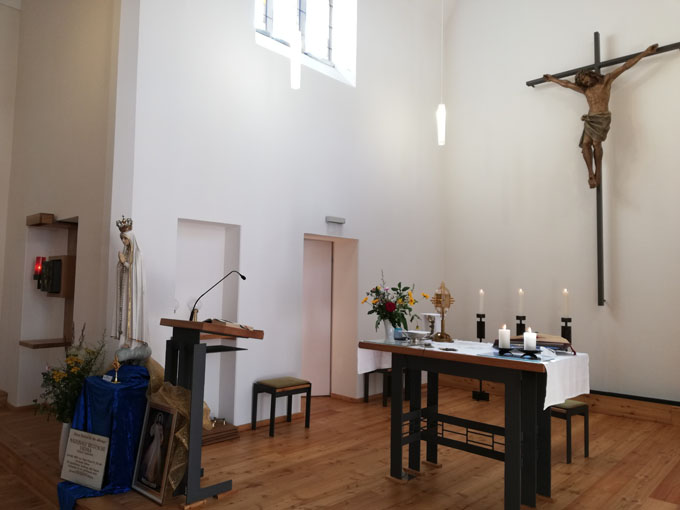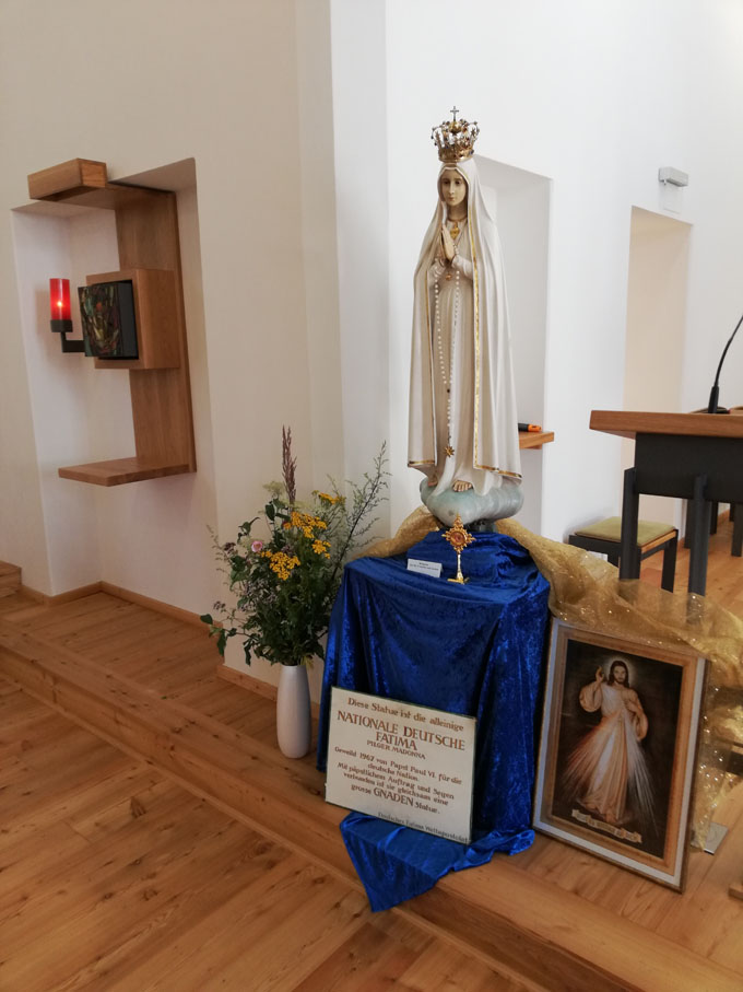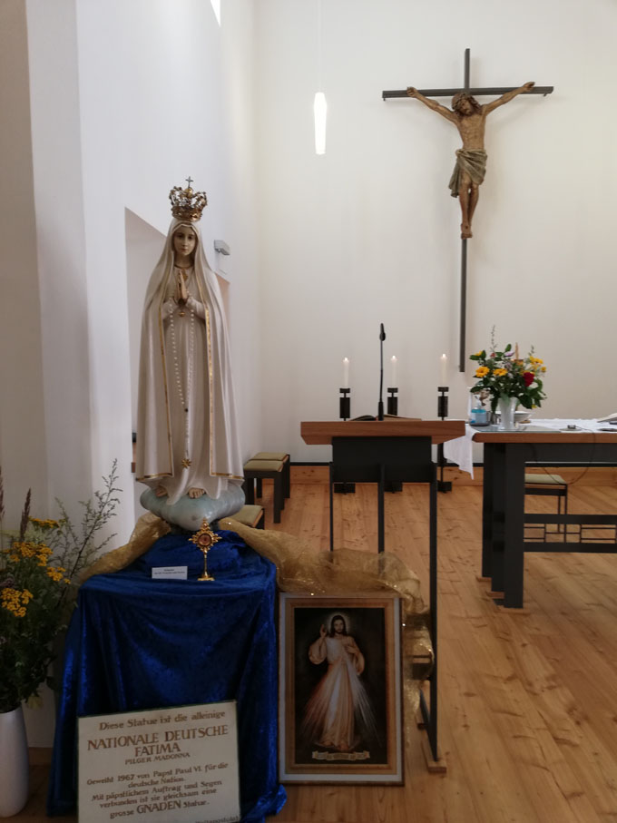 Die Radeberger Umgebung ist kein Marienland. Nirgends findet man im öffentlichen Raum einen Bildstock mit der Muttergottes oder eine Marienfigur an einem Haus oder am Wegesrand. In unserem neuen kath. Pfarrverbund mit Kamenz, Bischofswerda und Radeberg ist auch keine Pfarrkirche mit dem Patronat Mariens bekannt. Nur die Kapelle in Pulsnitz ist der Muttergottes geweiht. Aus alter, vorreformatorischer Zeit kennen wir in der weiteren Umgebung die Stadtkirchen St. Marien in Kamenz und in Pirna und an der Grenze unseres Pfarrgebietes die Kirchen „Maria am Wasser“ und die kath. Kapelle „Maria am Wege“ in Pillnitz. Ob aus diesen Gründen oder unbewusst dessen, machte sich die Fatima – Pilgermadonna, die durch ganz Deutschland reist, auch am Dienstag, den 27. Juli 2021 auf den Weg zur Wochentagsmesse um 9:00 Uhr in unsere 138 Jahre alte kath. Kirche in Radeberg. Sie stand auf einem kleinen, mit blauem Stoff überzogenen Podest im Altarraum linkes neben dem Ambo. Mit Blumen geschmückt und mit der Krone auf dem Haupt war die etwa einen Meter große Kopie der Originalmadonna von Fatima recht majestätisch anzuschauen. Trotz kurzfristiger Ankündigung waren etwa 15 Gläubige gekommen, doppelt so viele, als sonst am Dienstag früh.