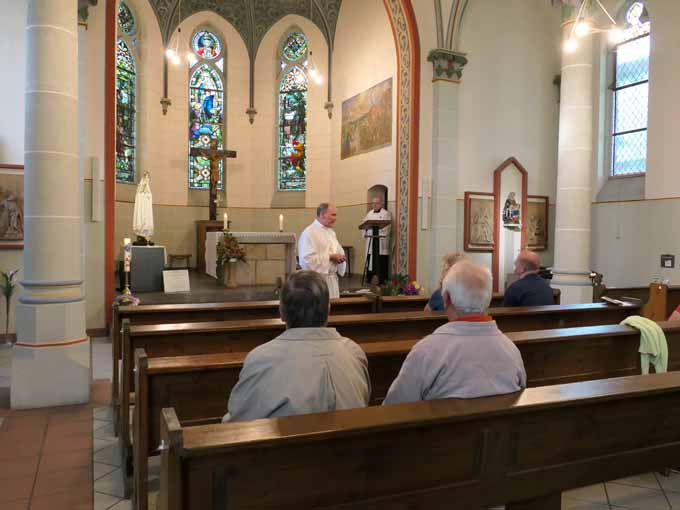 Um 15.00 Uhr Andacht in der Wallfahrtskirche, in der schon Papst Benedkit XVI. mit den Gläubigen des Eichsfeldes gebetet hat. Im Rahmen der Andacht wurde erklärt, was es mit der Pilgermadonna auf sich hat: dass sie von Papst Paul VI. 1967 in Fatima geweiht wurde; dass sie eigens für Deutschland geweiht wurde; dass es ihr Auftrag ist, durch ganz Deutschland zu pilgern; dass sie dem Fatima-Weltapostolat zur Betreuung anvertraut ist; dass ihre Pilgerfahrt durch Deutschland im Fatima-Jubiläumsjahr 2017 neu belebt wurde.