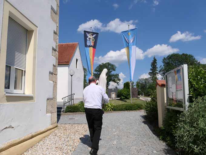 Vor der Wallfahrtskirche Maria Schnee wird die Pilgermadonna bereits von P. Johannes, dem Pfarrer von Aufhausen, erwartet. In der Kirche ist das Allerheiligste ausgesetzt, denn hier in Maria Schnee wird die 24stündige eucharistische Anbetung gepflegt.