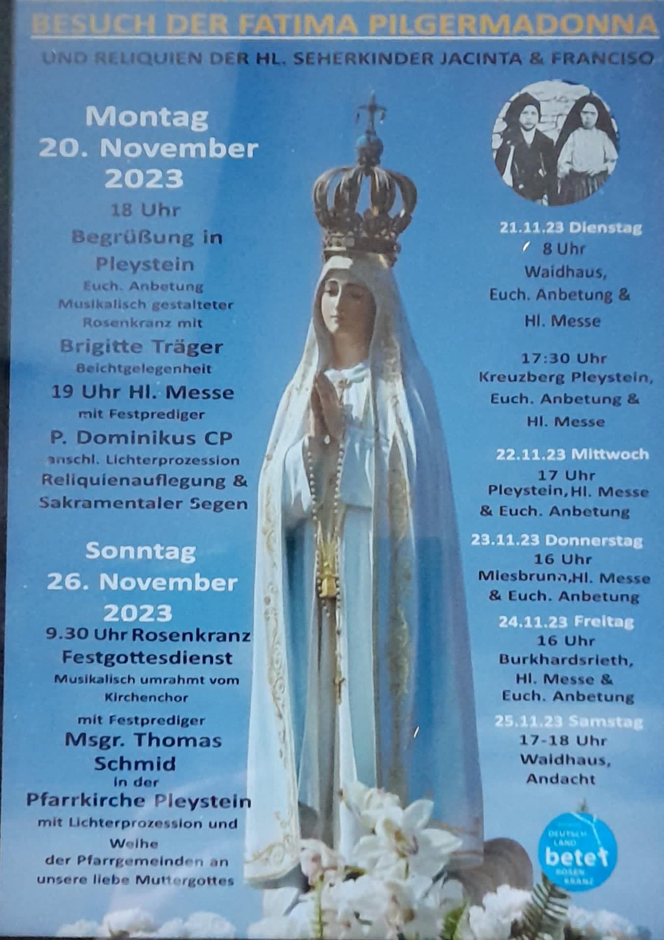 Vom 20. bis 26. November 2023 besuchte die Fatima-Nationalmadonna die Seelsorgeeinheit Pleystein, Miesbrunn und Burkhardsrieth.