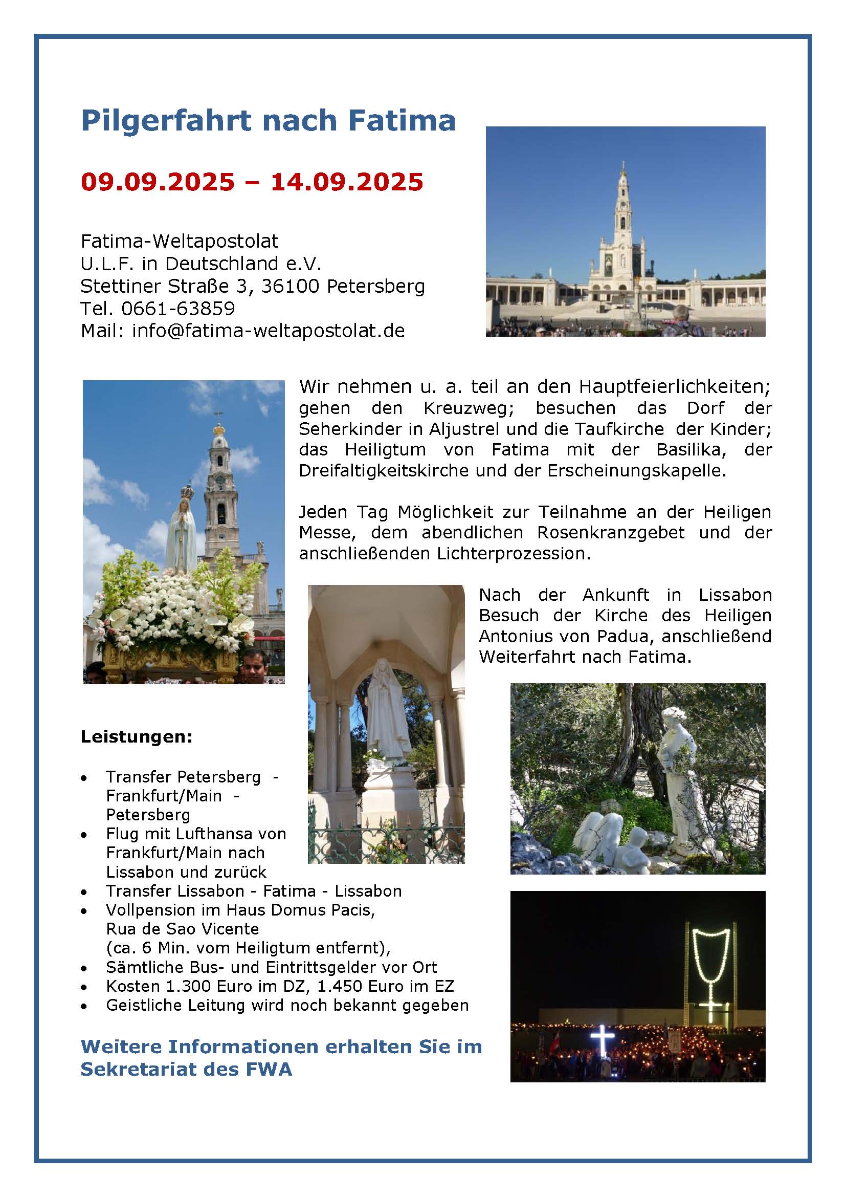 Auch in diesem Jahr wollen wir zum Ort der Erscheinungen der Gottesmutter nach Fatima pilgern. Ablauf und Rahmenprogramm der Pilgerfahrt sind ähnlich wie in den verganenen Jahren.